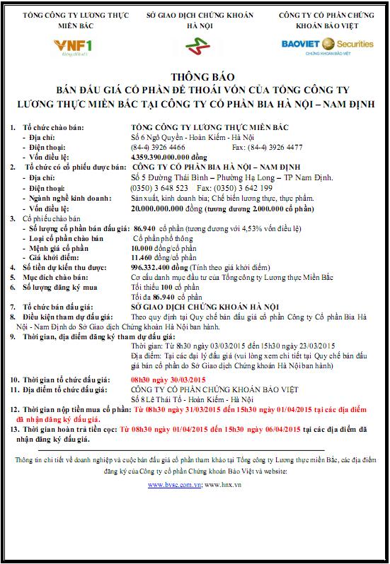 TCTLTMB: Thông báo bán đấu giá cổ phần Công ty CP Bia Hà nội - Nam Định