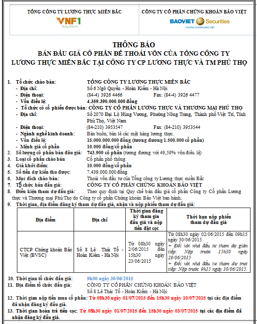 Thông báo bán đấu giá cổ phần tại Công ty Cổ phần Lương thực và Thương Mại Phú Thọ