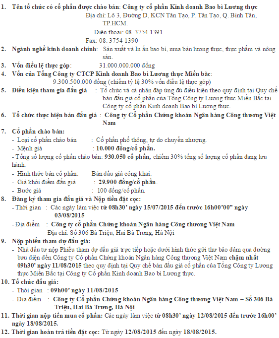 Thông báo bán đấu giá cổ phần của Tổng Công ty Lương thực Miền bắc tại Công ty cổ phần Kinh doanh Bao bì Lương thực