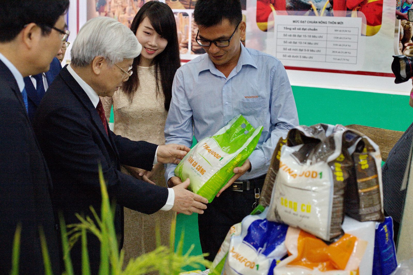 Tổng bí thư Nguyễn Phú Trọng thăm gian hàng trưng bày sản phẩm gạo thương hiệu của Tổng công ty Lương thực miền Bắc tại Triển lãm 70 năm thành tựu Kinh tế - Xã hội