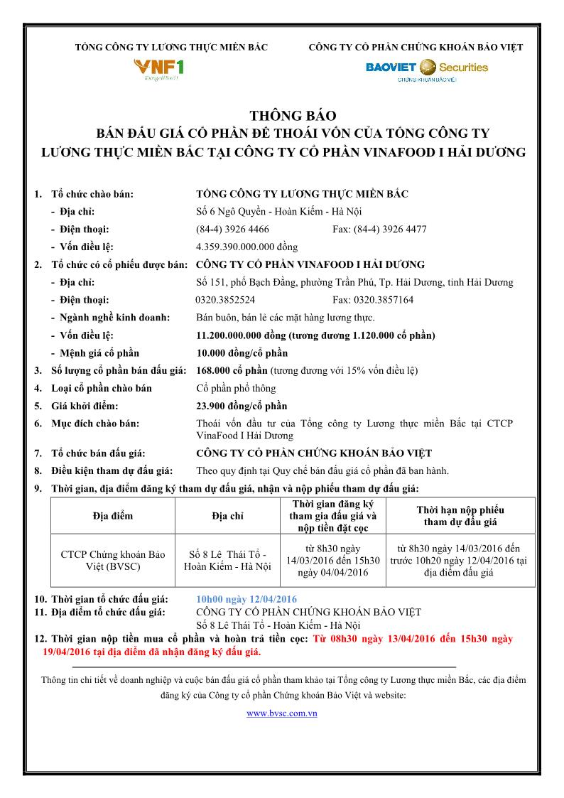 THÔNG BÁO BÁN ĐẤU GIÁ CỔ PHẦN TẠI CÔNG TY CỔ PHẦN VINAFOOD1 HẢI DƯƠNG