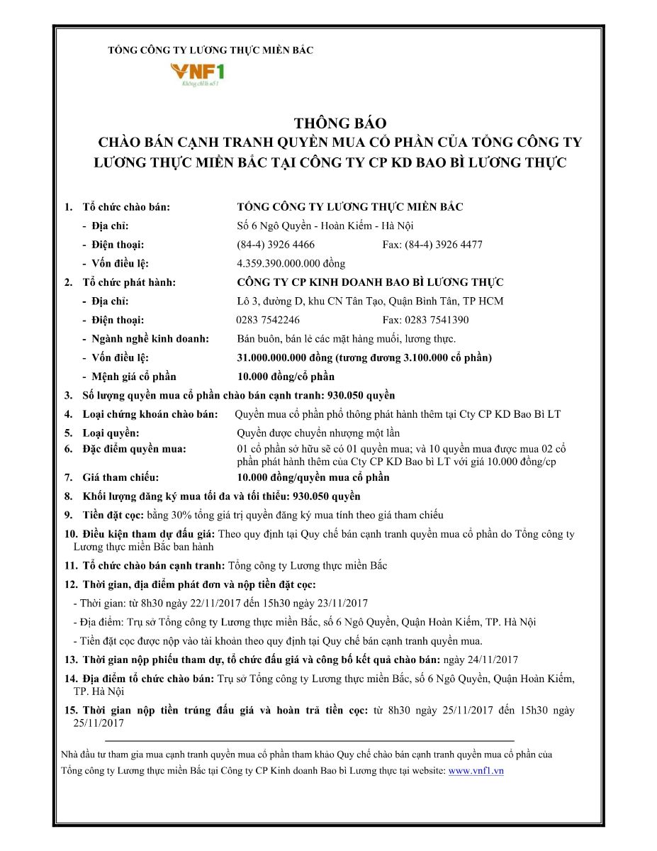 THÔNG BÁO CHÀO BÁN CẠNH TRANH QUYỀN MUA CỔ PHẦN CỦA TỔNG CÔNG TY LƯƠNG THỰC MIỀN BẮC TẠI CÔNG TY CP KD BAO BÌ LƯƠNG THỰC