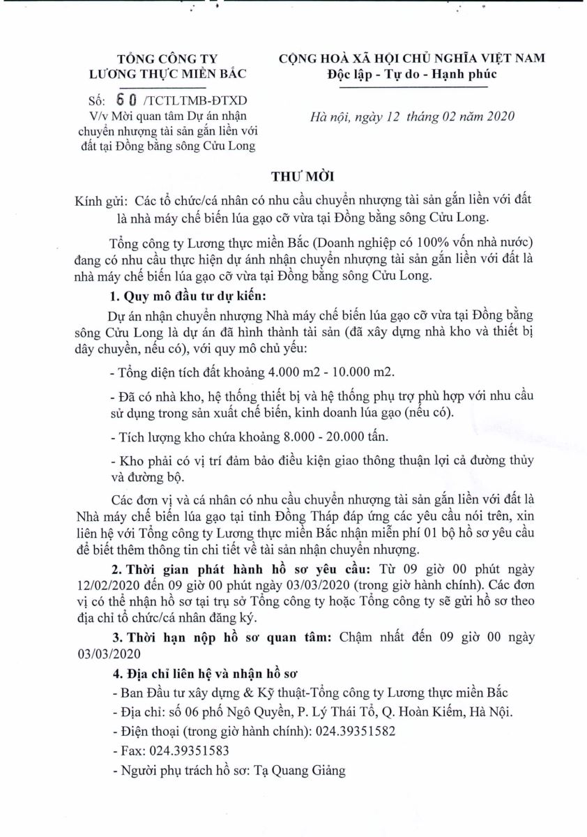 TCTLTMB: Thư mời quan tâm Dự án nhận chuyển nhượng kho tại ĐBSCL